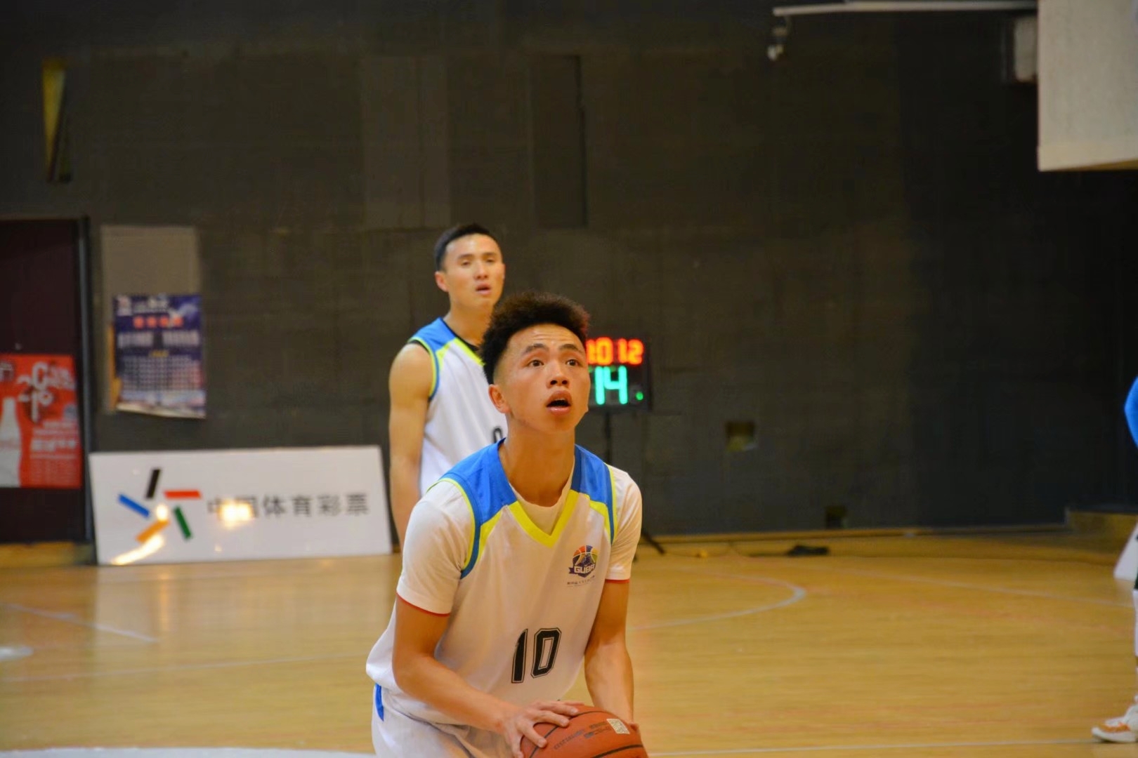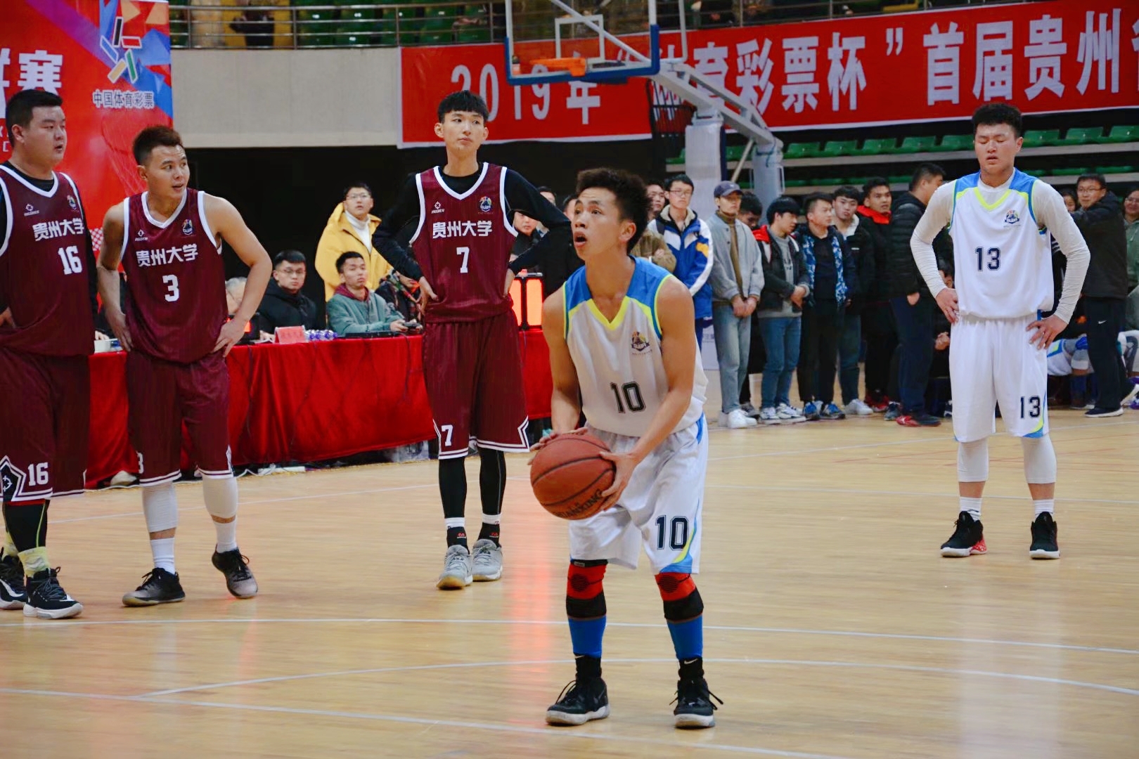 石学念(中)在首届贵州省大学生篮球联赛贵州师范学院对阵贵州大学的比赛中罚球。受访者供图