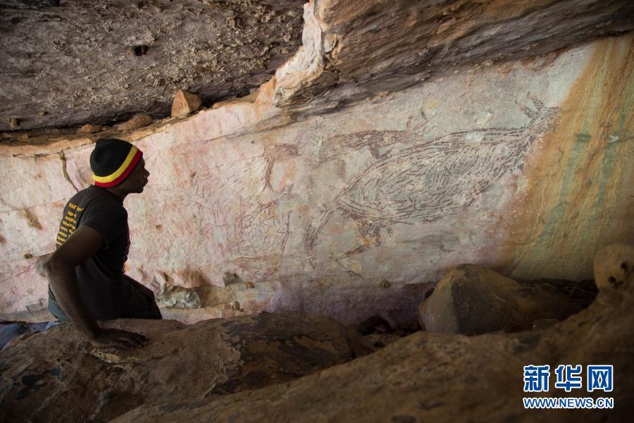 这张2016年7月15日拍摄的资料照片显示,在澳大利亚金伯利地区,一名原住民观看袋鼠岩画。