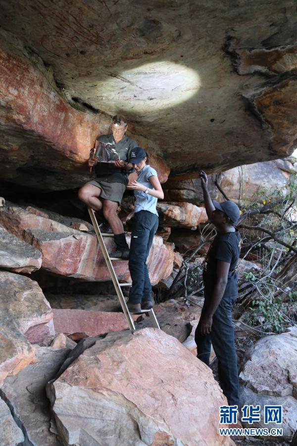 这张2016年7月7日拍摄的资料照片显示,在澳大利亚金伯利地区,研究人员记录袋鼠岩画。新华社发(斯文·欧茨曼摄)