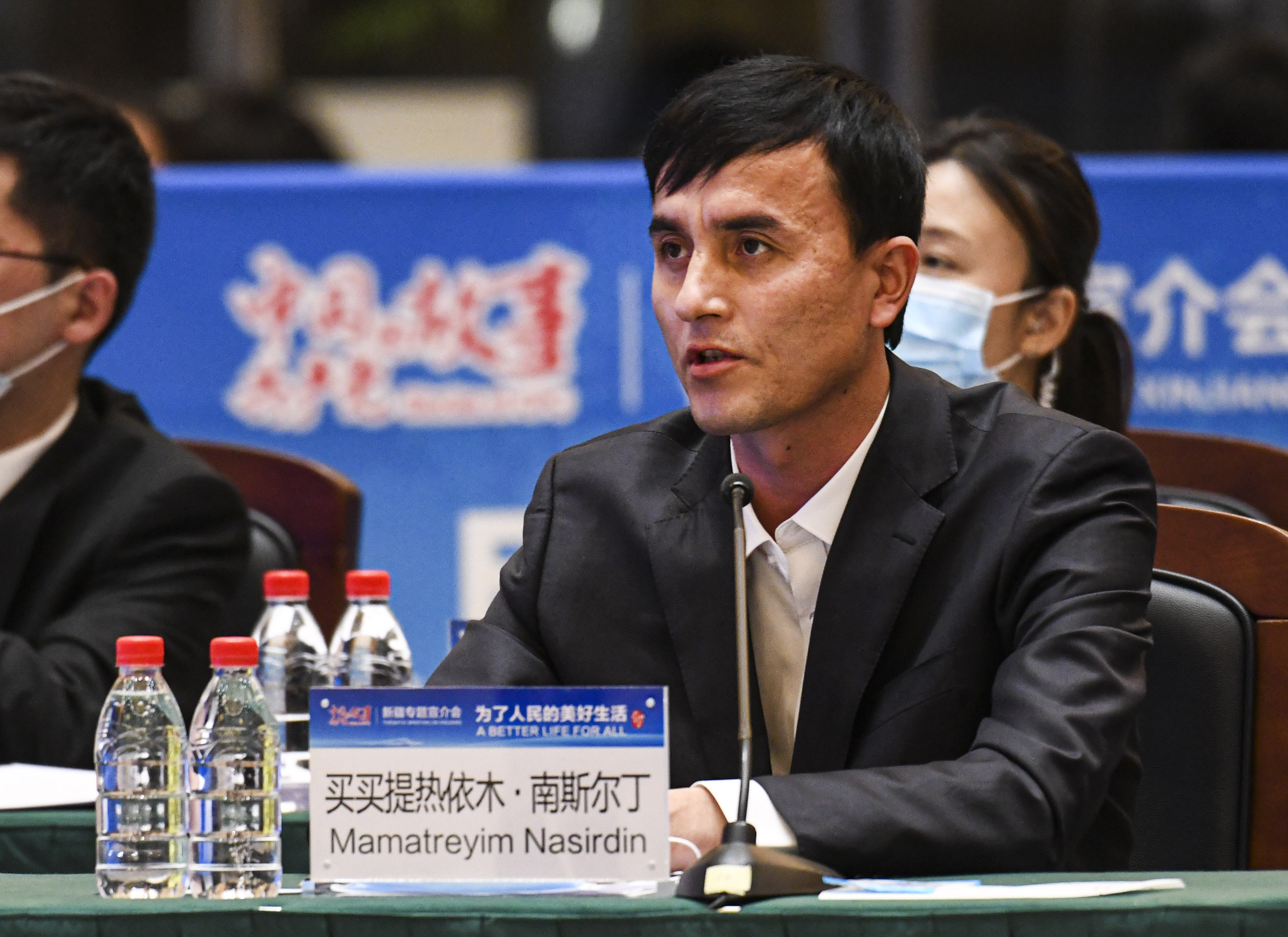 2月22日,在“中国共产党的故事”新疆专题宣介会现场,来自克孜勒苏柯尔克孜自治州阿克陶县的买买提热依木·南斯尔丁分享自己的故事。新华社记者 王菲 摄