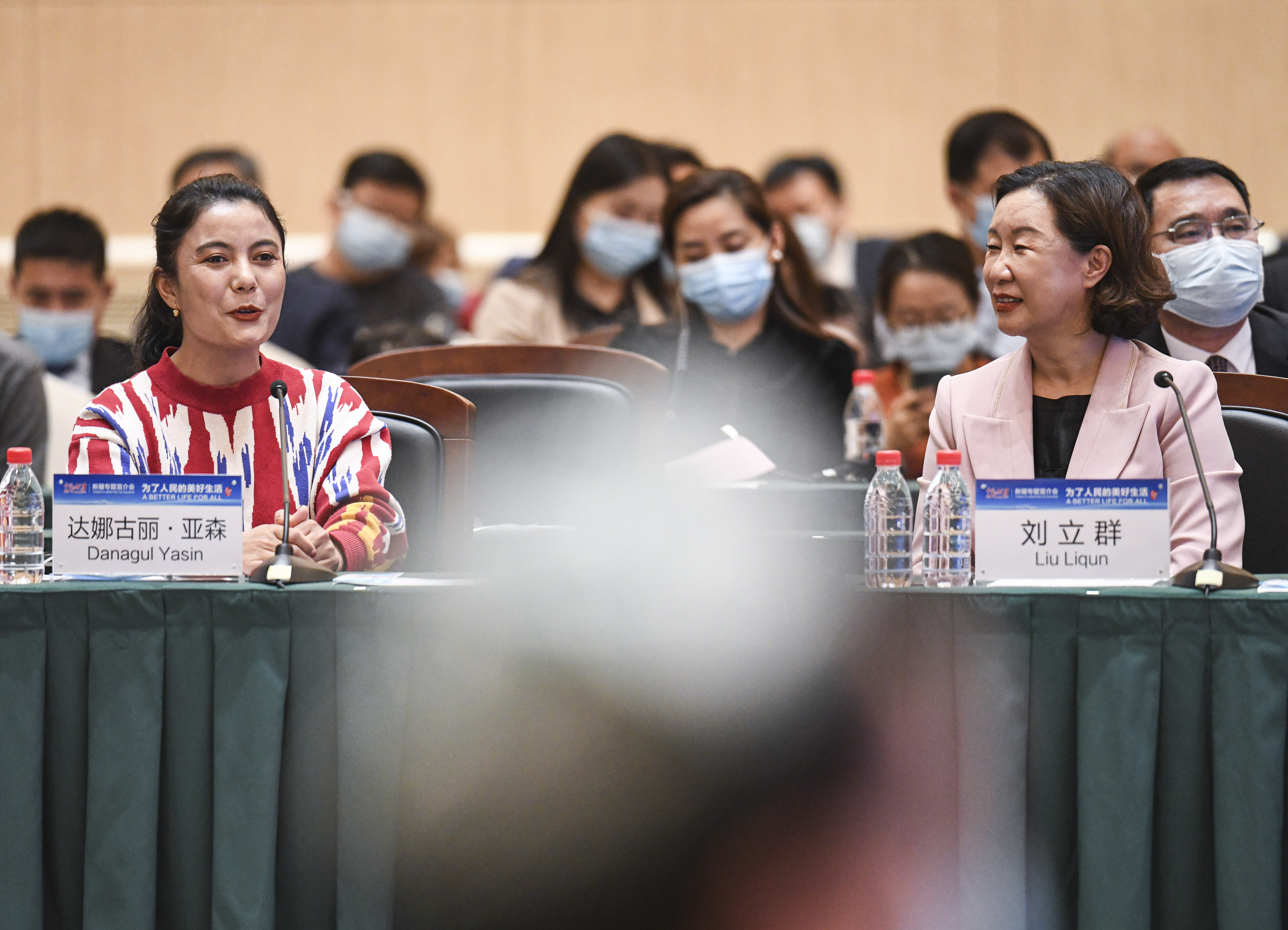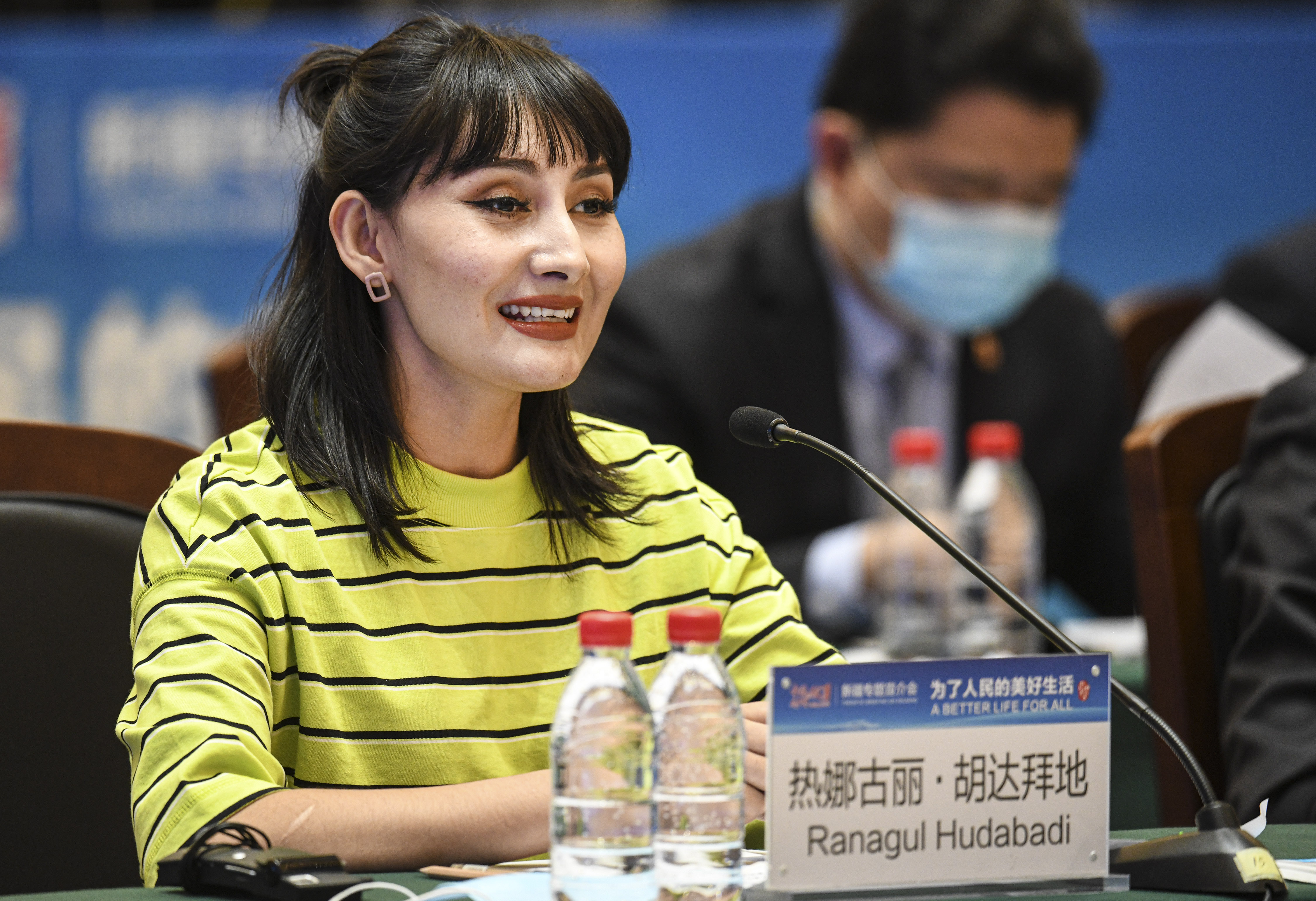2月22日,在“中国共产党的故事”新疆专题宣介会现场,新疆喀什地区少数民族妇女代表热娜古丽·胡达拜地讲述自己的故事。新华社记者 王菲 摄