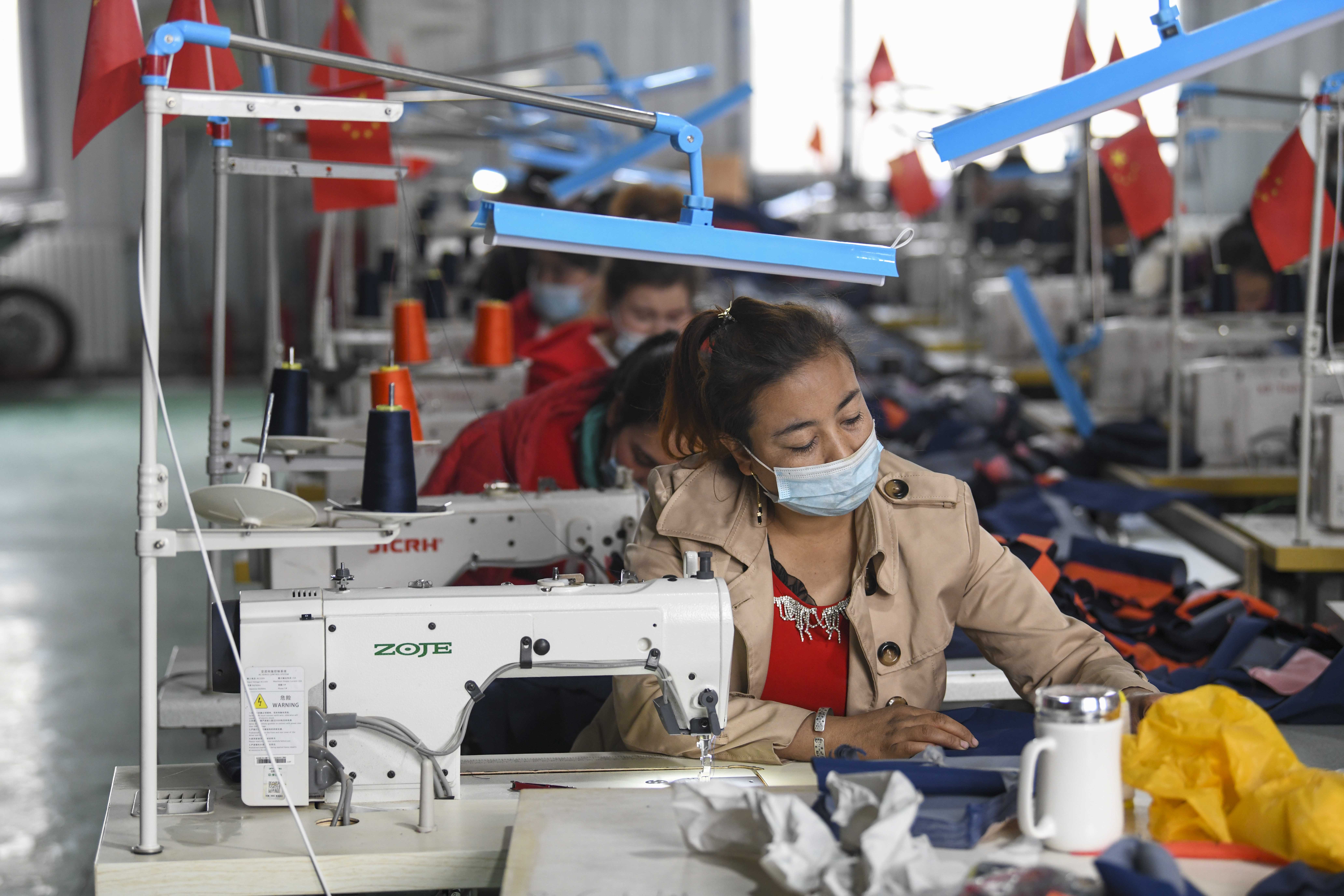 在位于新疆皮山县桑株镇库木艾格勒村的一家服装生产企业的车间里,工作人员正在缝制衣服(2020年11月20日摄)。新华社记者 赵戈 摄