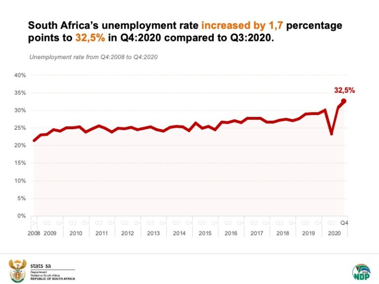 据南非统计局当地时间2月23日公布的数据,南非2020年第四季度的失业率达到历史新高,官方失业率达32.5%。