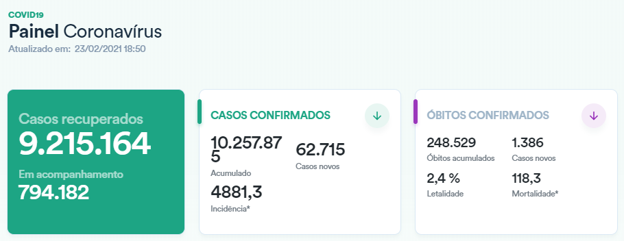 截至当地时间2月23日,据巴西卫生部发布的数据,巴西单日新增新冠肺炎确诊病例62715例,累计确诊病例10257875例;单日新增死亡病例1386例,累计死亡248529例;累计治愈9215164例。