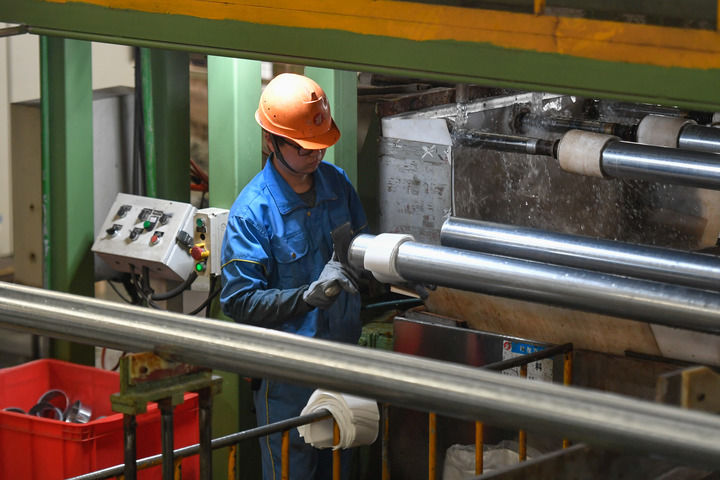 (图片说明)新华社照片,湖州(浙江),2021年2月22日,工人在位于吴兴区八里店镇的金洲管道科技股份有限公司的生产车间作业。该企业的300多位员工积极响应“就地过年”号召,正月初七已全面复工。