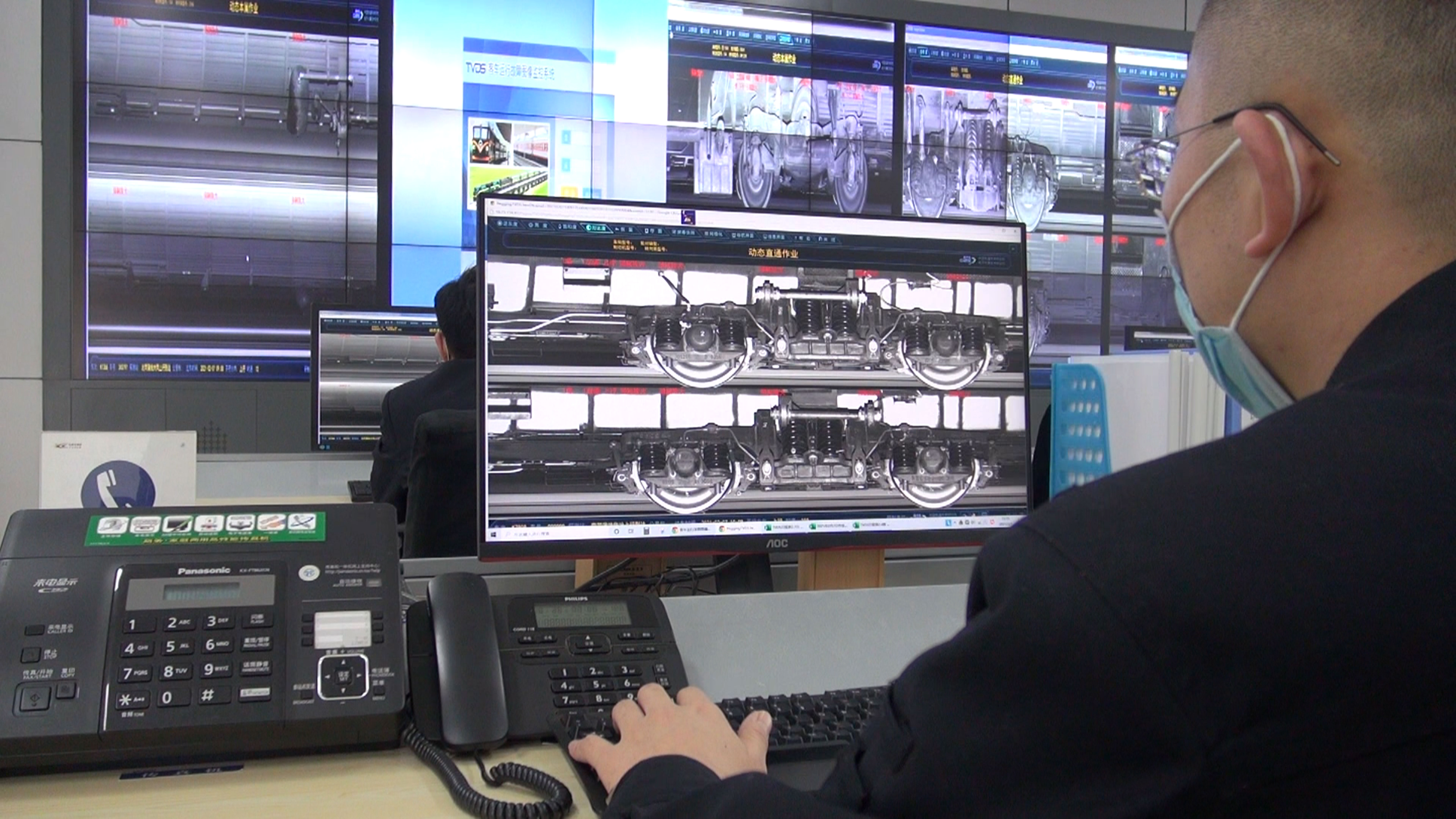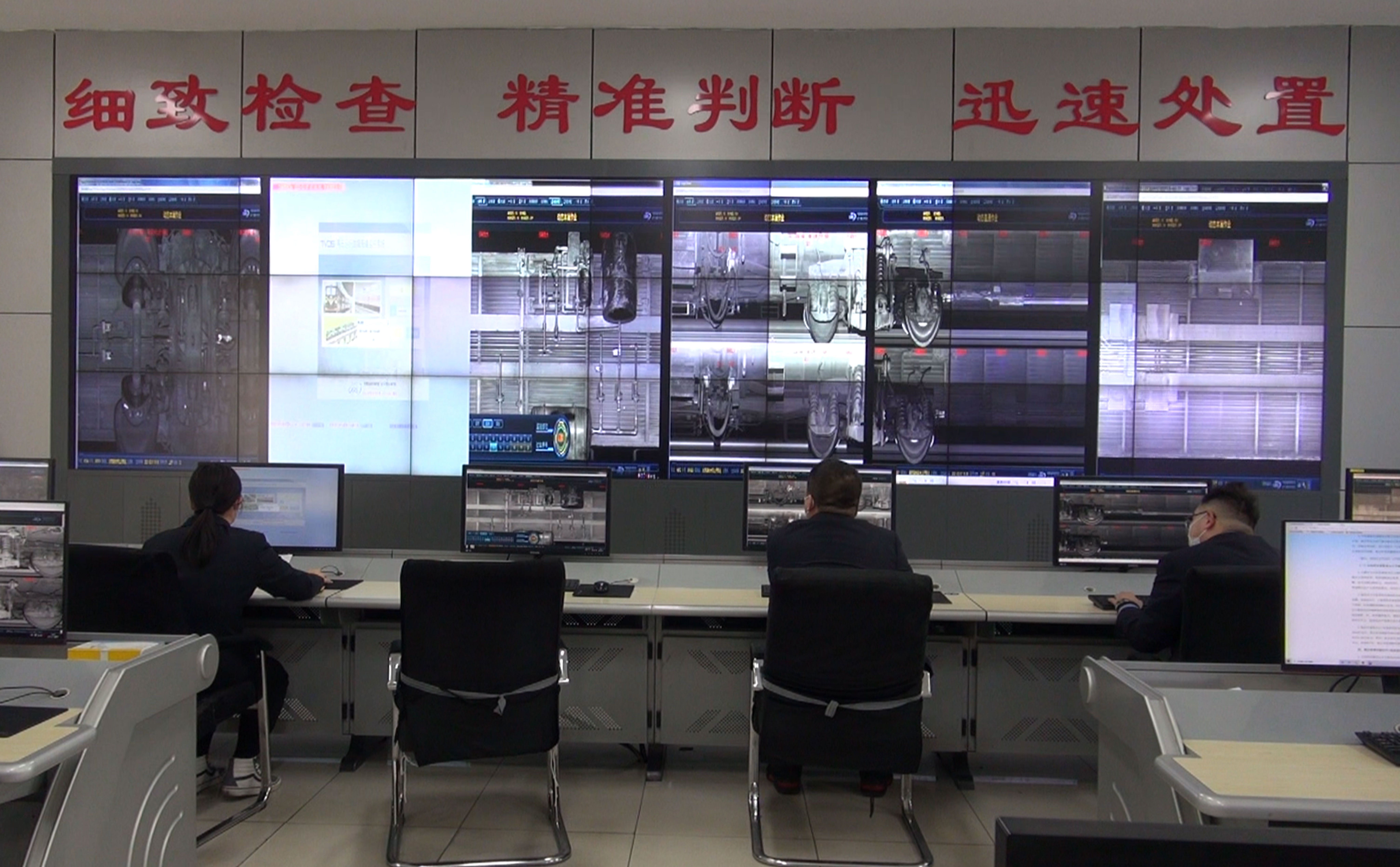 巨大的电子屏幕上,实时显示着列车侧部、底部的“透视图”,坐在电脑前的工作人员更像是大夫在查看X光片:他们紧盯着电脑屏幕,鼠标光标在屏幕上飞舞,生怕遗漏“病灶”信息……