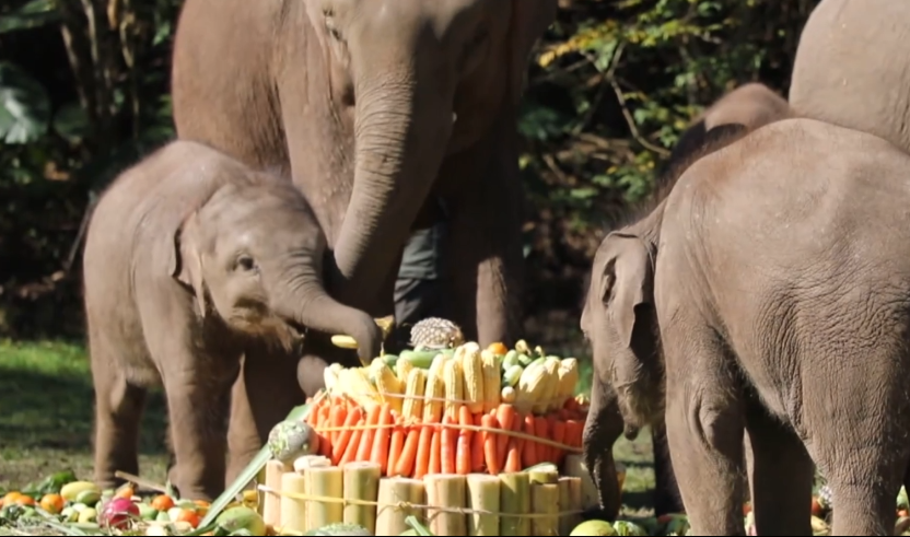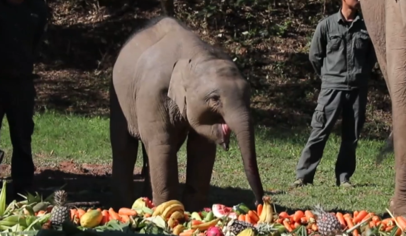 22日,位于西双版纳野象谷的亚洲象种源繁育及救助中心里热闹非凡,工作人员和野象谷的大象们一起为刚满周岁的小象“小九”庆生。