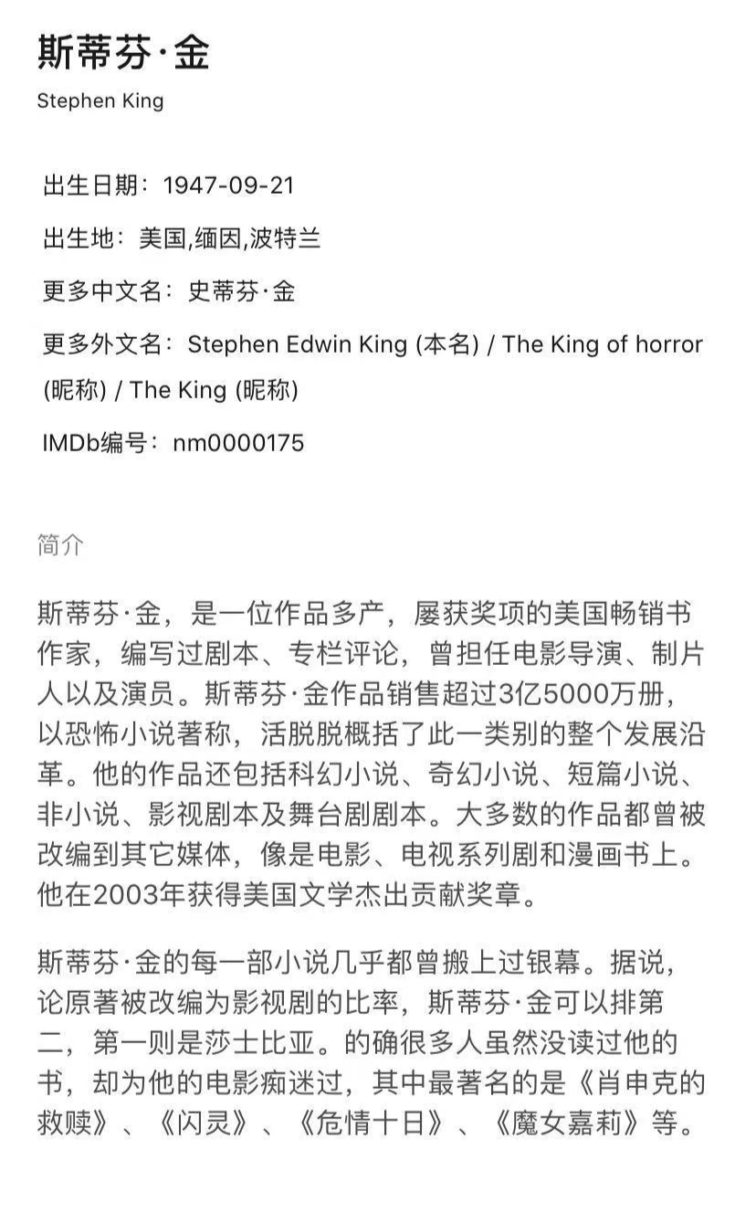 豆瓣显示,斯蒂芬·金编写过剧本、专栏评论,也曾担任电影导演、制片人以及演员,他的代表作有《肖申克的救赎》《闪灵》等。