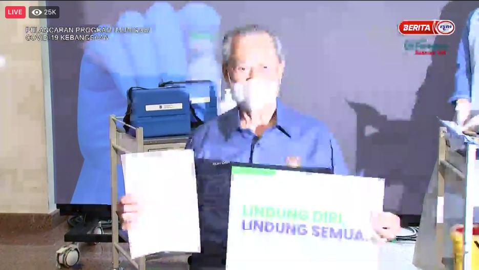 △马来西亚总理穆希丁接种新冠疫苗(图片来源:大马国营电视台直播截图)