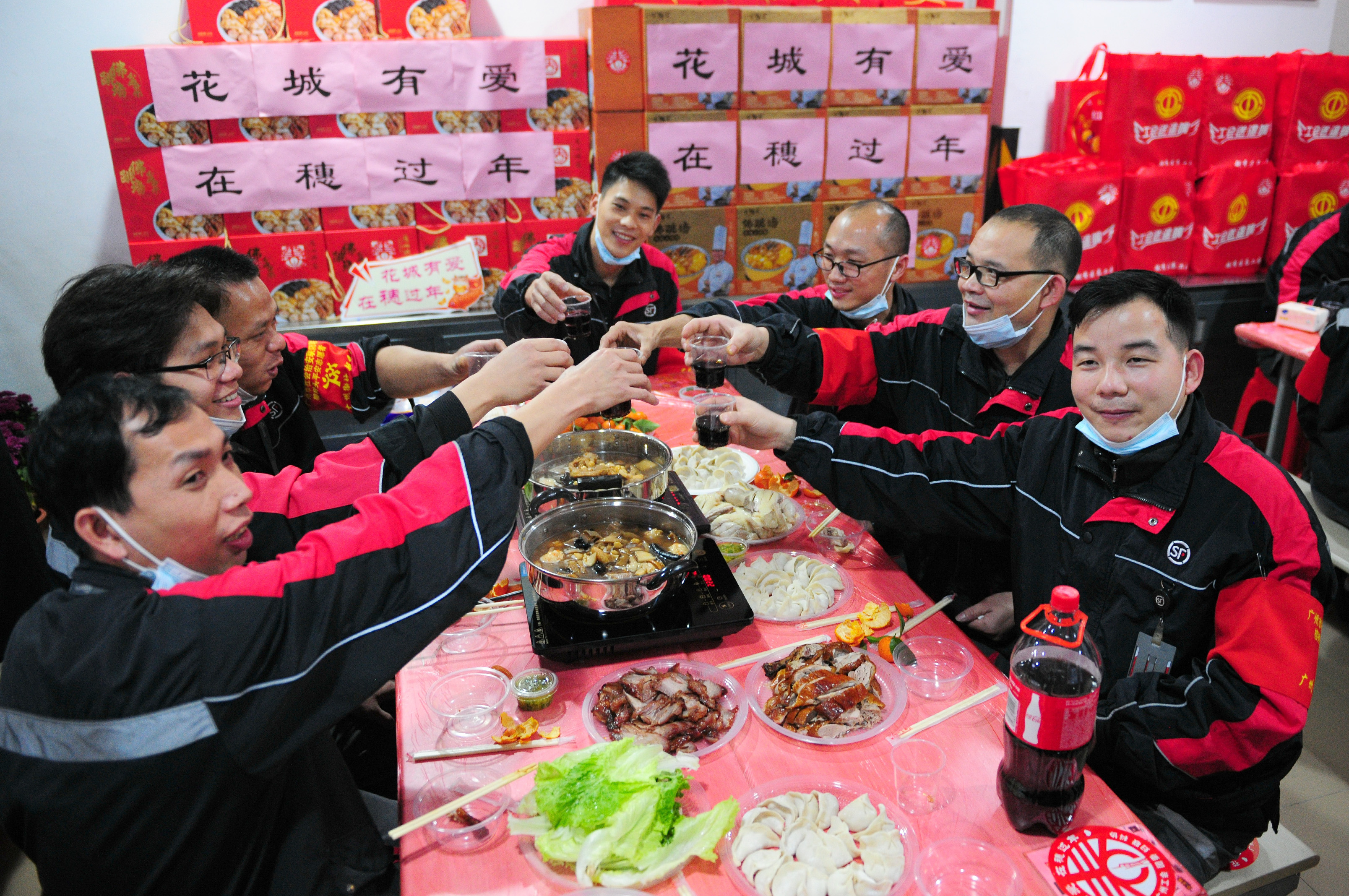 △2月9日,在穗过年坚守岗位的快递员一起吃盆菜。
