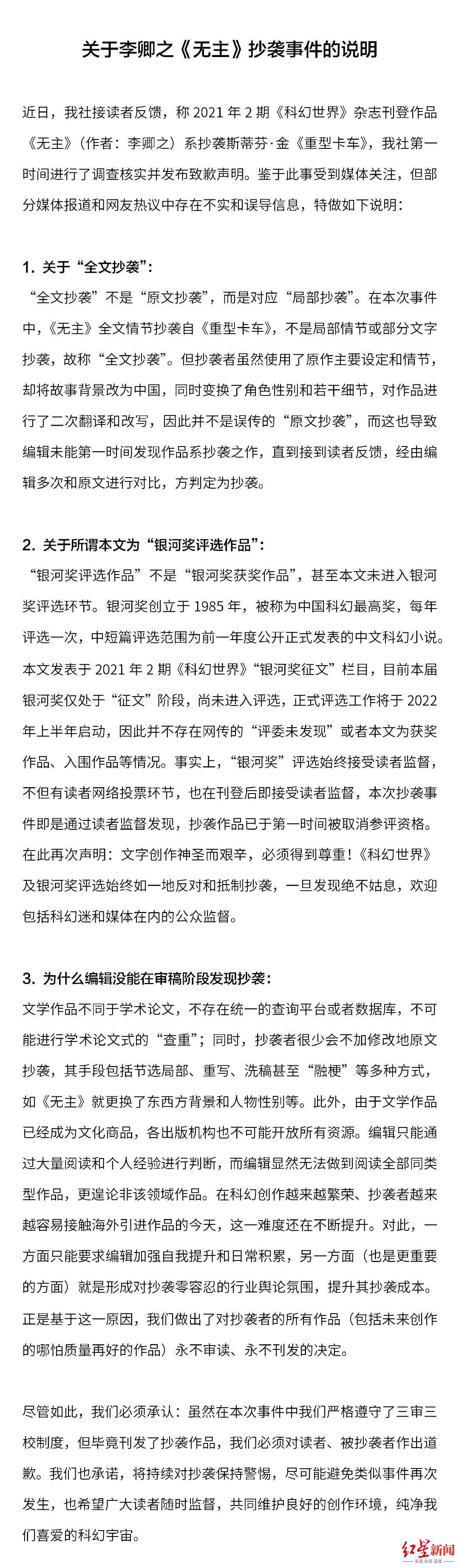 今日(2月24日)下午,《科幻世界》杂志又刊发了一篇更加详尽的说明,针对这一抄袭事件的主要质疑做出回答(全文见下图)。