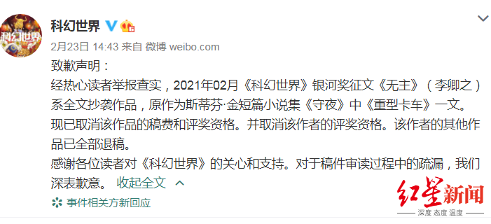 日前,《科幻世界》杂志2021年2月刊上的一篇银河奖征文《无主》,被读者指出存在严重抄袭问题。2月23日下午,《科幻世界》在其官方微博上发表致歉声明,其中提到《无主》的作者李卿之“全文抄袭”了著名恐怖小说作家斯蒂芬·金的短篇小说集《守夜》中的《重型卡车》一文。