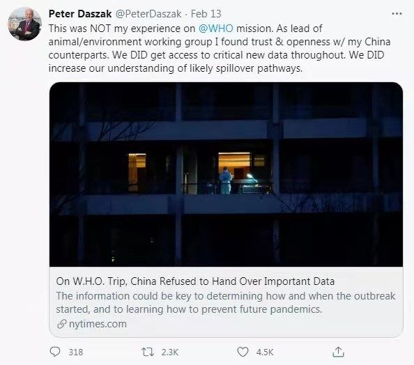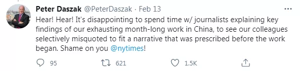 《纽约时报》采访对象之一、美国动物学家彼得·达萨克随即在社交媒体推特上“回怼”说:“这不是我在世卫组织任务中的经历。作为动物及环境工作组的负责人,我感到中国同行们值得信任,感受到他们的坦率。我们的确获得了关键的新数据,也增加了有关病毒传播途径的了解。”