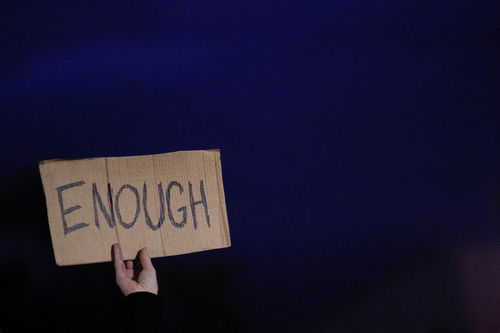 2020年9月4日,在美国纽约州罗切斯特市,抗议者高举写着“够了”的牌子。新华社/路透