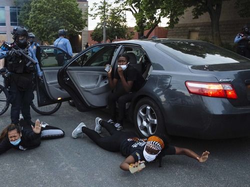 2020年5月31日,在美国明尼苏达州明尼阿波利斯市,警察要求几名女子下车。新华社发(安格斯·亚历山大摄)