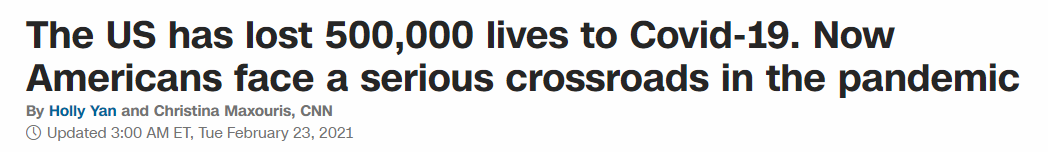 美国有线电视新闻网(CNN)报道指出,50万这个数字凸显了一年前开始席卷这个国家的噩梦。时任美国总统特朗普曾宣称美国在很大程度上控制住了疫情,这表明他对即将在他任期内发生的灾难毫无准备。
