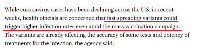 彭博社援引卫生官员的话警告称,虽然美国单日病亡人数有所下降,但疫苗接种还需要数月时间,病毒的突变可能很快引发新的疫情反弹。截至当地时间22日,全美已接种新冠疫苗约6310万剂,但研究表明,现有疫苗对更具传染性的新冠病毒变异株的效果并不理想。