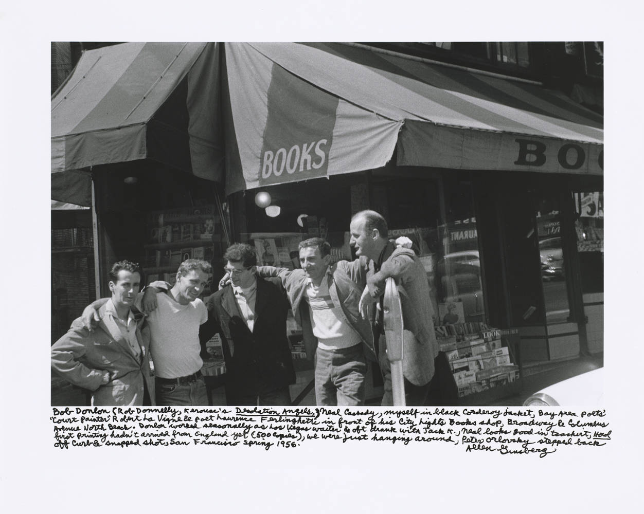 “垮掉的一代”核心成员们在城市之光门口,摄于1956年。从左至右:鲍勃·唐林,尼尔·卡萨蒂,艾伦·金斯堡,罗伯特·拉文奇,劳伦斯·金斯堡。