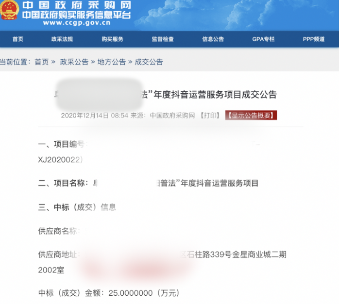 为缓解人手紧张、能力不足问题,一些地方不惜花高价购买第三方服务。记者检索发现,近半年来,有300多条各地政府部门的采购公告涉及政务短视频账号运营、视频制作,价格多在数十万元以上。其中,2020年12月14日发布的某地司法局年度短视频账号运营服务项目成交公告显示,一家文化传媒公司以25万元的报价中标。