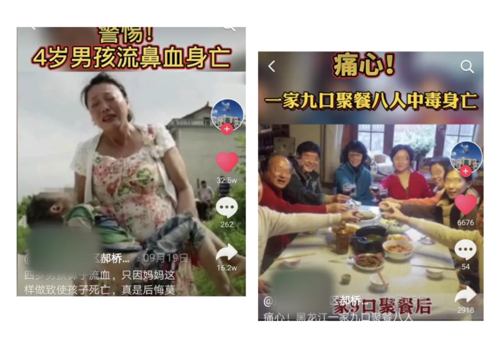 还有部分官方账号喜欢发布耸人听闻的消息。“警惕!4岁男孩流鼻血身亡”“痛心!一家九口聚餐八人中毒身亡”……这些都是某乡镇官方短视频账号发布的异地新闻内容。在疫情防控中,一张标题为“广州女毒王境外返回确诊,坐遍14条地铁”的图片曾被某官方账号使用,在网上造成不良影响。