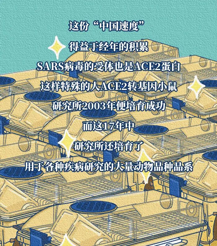 通过培育病毒受体人源化的动物,研究所完成了诸多“全球第一”:全球第一个科学证实了新冠病毒受体和致病病原体,揭示了病理特征,在国际上率先构建了动物模型;全球第一个解决了新冠疫苗研发的“卡脖子”技术瓶颈,使中国成为第一个可以按照科学程序研发新冠疫苗的国家;评价了国家部署的80%疫苗,第一时间将该技术和标准提供给世界卫生组织,被各国科学家和欧美疫苗研发机构采用;国内外第一个上市的疫苗都在这里完成评价工作......