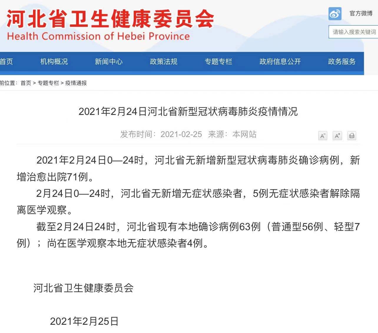 2021年2月24日0—24时,河北省无新增新冠肺炎确诊病例,新增治愈出院71例。