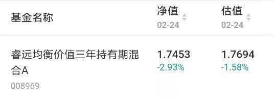 类似的还有睿远均衡价值三年持有期混合A,24日估算净值下跌1.58%,实际净值跌幅达到2.93%。该基金前十大重仓股(截至2020年四季度末)持仓占比合计46.20%,仅三只个股持仓占比超5%,其余在3%-4%左右,第十大重仓股占比仅1.84%,持仓较为分散。其中,万科A、瀚蓝环境、中远海控24日跌幅不足1%,万华化学、东方雨虹、三诺生物跌幅也不足2%,华润啤酒、小米集团、威高股份和生物股份跌幅稍大。