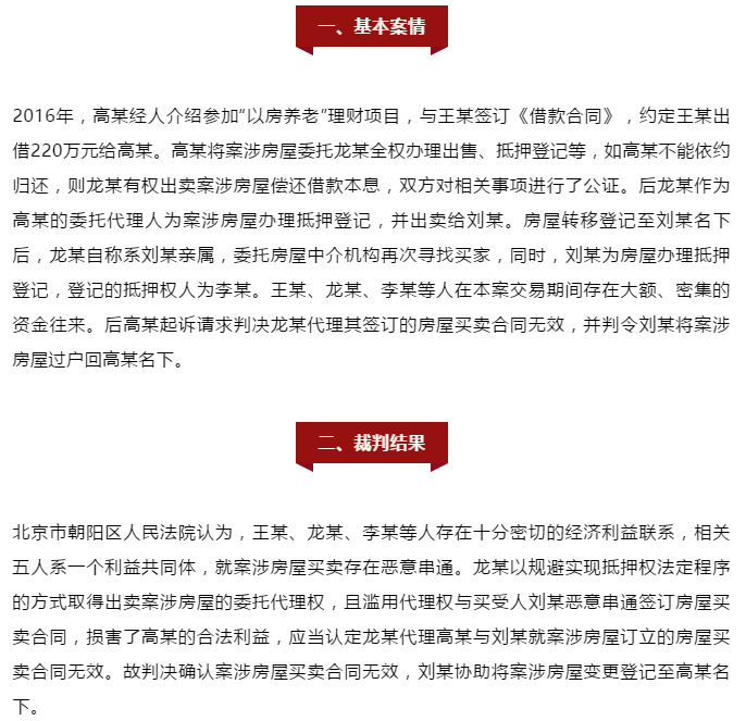 高某诉刘某、龙某确认合同无效纠纷案提示,老年人“以房养老”理财需谨慎。