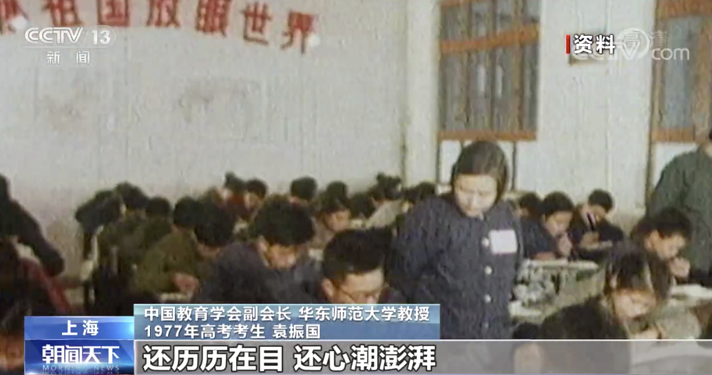 中国教育学会副会长 华东师范大学教授 1977年高考考生 袁振国:还历历在目,还心潮澎湃。我当时我们正在乡下插队劳动,听到了中央关于恢复高考的决定真是奔走相告。复习没有材料,没有书,靠相互之间传抄,拿到一个好的试题,连夜地大家要抄了这个,传递给下面一个人。