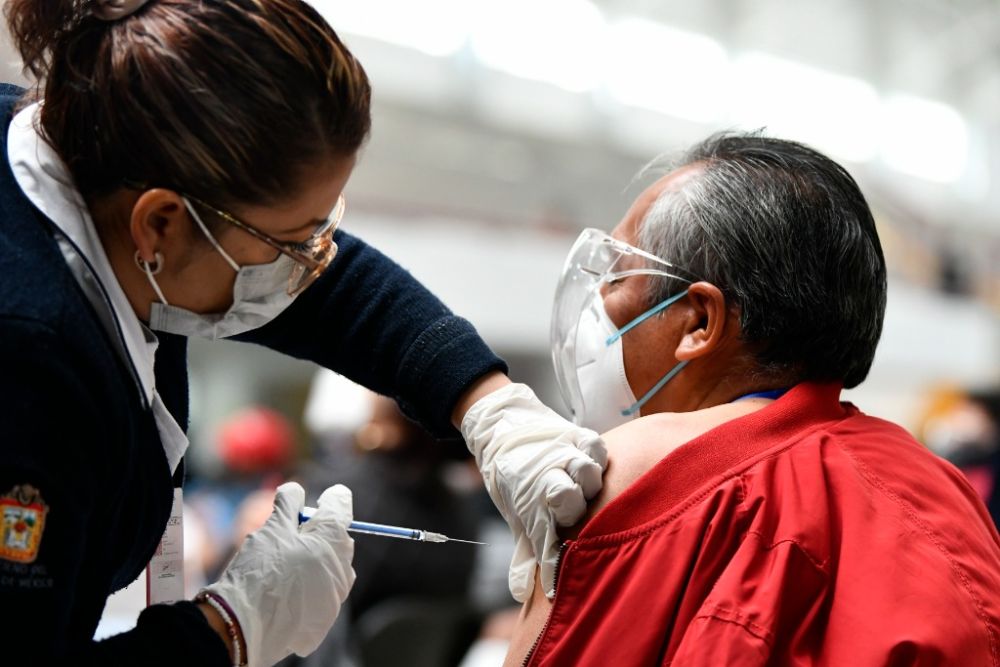 2月22日,在墨西哥埃卡特佩克,医务人员为一名老年人接种中国科兴新冠疫苗。(新华社记者辛悦卫摄)