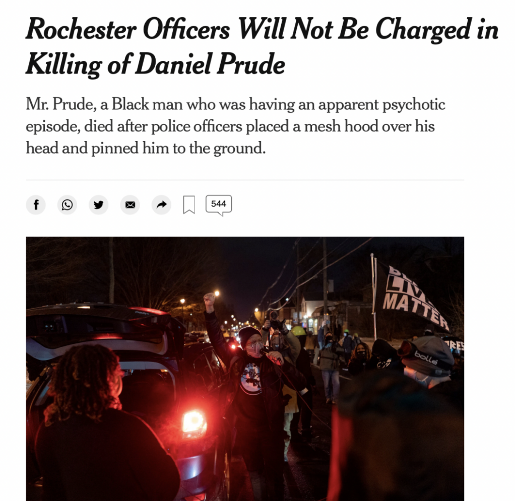 △《纽约时报》报道,罗切斯特市警察不会因丹尼尔·普鲁德之死被起诉