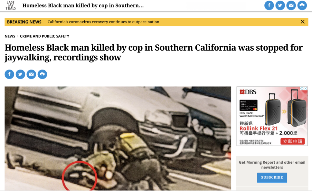 △加州《东湾时报》报道,南加州无家可归的非洲裔男子被警察射杀,死因竟是乱穿马路