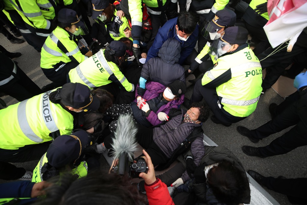 警方出动500多名警力,对其强行驱离,期间双方发生混战,有十几个民众钻进棋盘状构造物的网格内,抵抗警方执法。