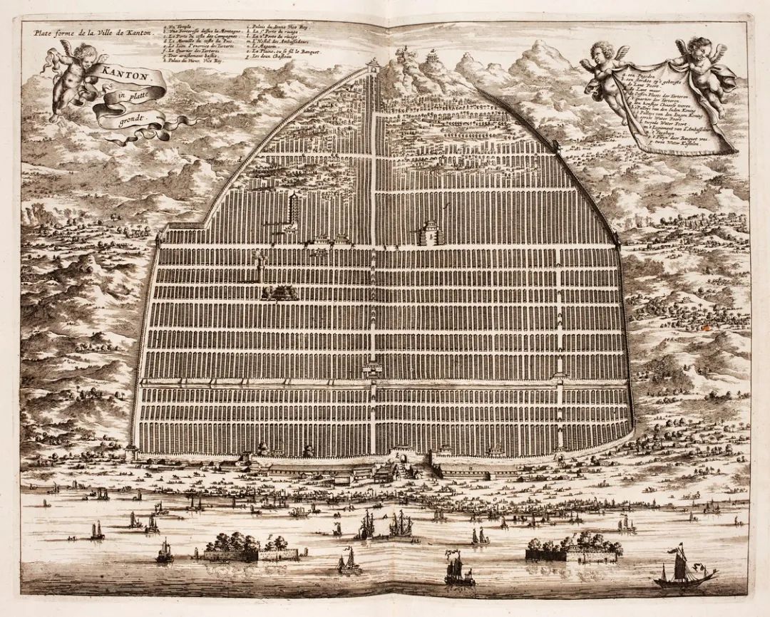 17世纪的广州地图,广州城已有相当宏大的规模。该图由荷兰旅行家Johan Nieuhof绘制,他曾在1655-1657年间从广州旅行至北京。