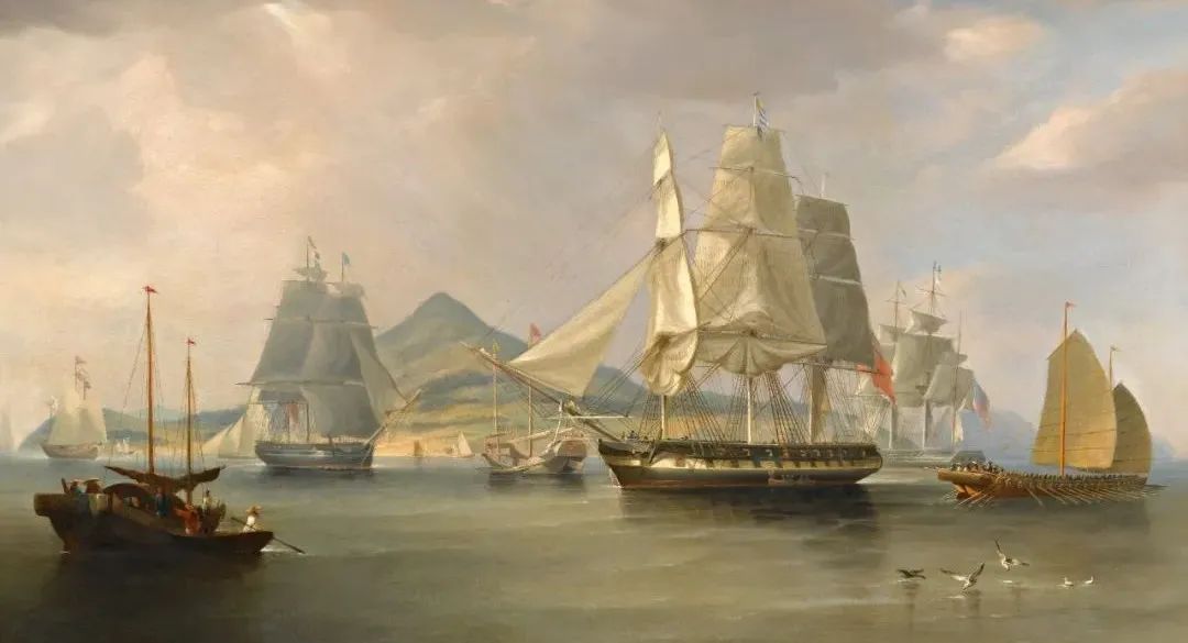 英国运送鸦片的大船与中国渔民的渔船形成了鲜明的对比。