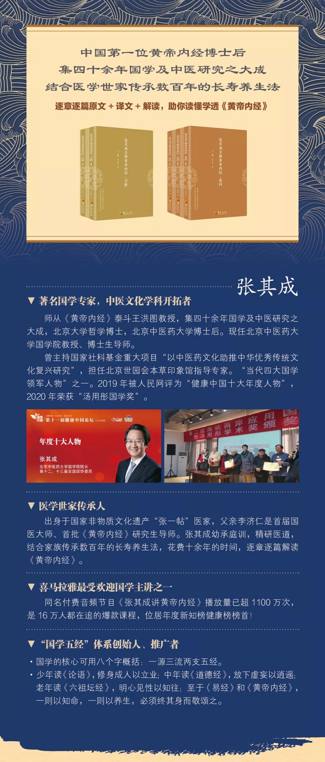 张其成,著名国学专家,中医文化学家。享受国务院特殊津贴专家,汤用彤国学奖获得者,北京大学哲学博士,北京中医药大学国学院创院院长、教授、博士生导师,北京张其成中医发展基金会理事长,第12届、13届全国政协委员。国家级非遗“张一帖”医家第十五代传承人。北京大学、清华大学等十四所大学客座教授。先后任三个国家一级学会副会长,六个国家二级学会会长。