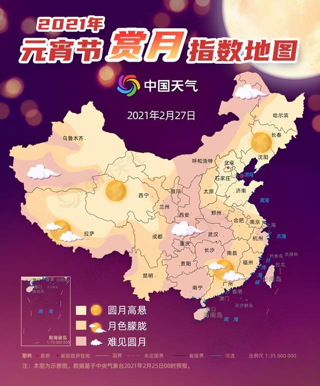 根据预报,元宵节(2月26日)当晚,吉林、辽宁、北京、天津、河北、山东、山西、青海、甘肃、云南、海南以及新疆南部、西藏北部等地天气晴朗,月明星稀,小伙伴们抬头即可观赏圆月;黑龙江、内蒙古西部、宁夏、河南等地的朋友可以看到“彩云追月”的美景;而陕西南部、四川东部、广西、广东、福建、重庆、贵州、湖南、湖北、江西、浙江、上海、安徽中南部、江苏中南部等地因为降水或云层较厚,无缘明月。
