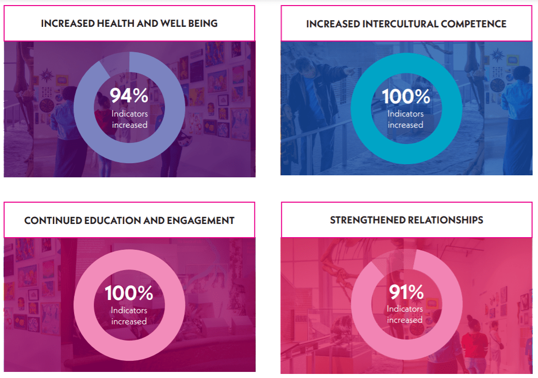 数据结果显示,参与调查研究的观众中:94%认为健康与幸福感得到了提升;100%认为跨文化能力得到了提升;100%认为持续教育与公共参与的能力得到了提升;91%认为强化人际关系的能力得到了提升。