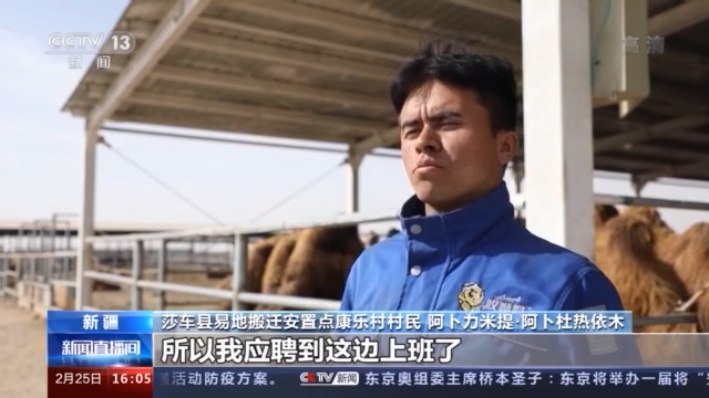 莎车县易地搬迁安置点康乐村村民 阿卜力米提·阿卜杜热依木:因为我也有一定的养殖技术,所以我应聘到这边上班了,一年能挣上四万左右。