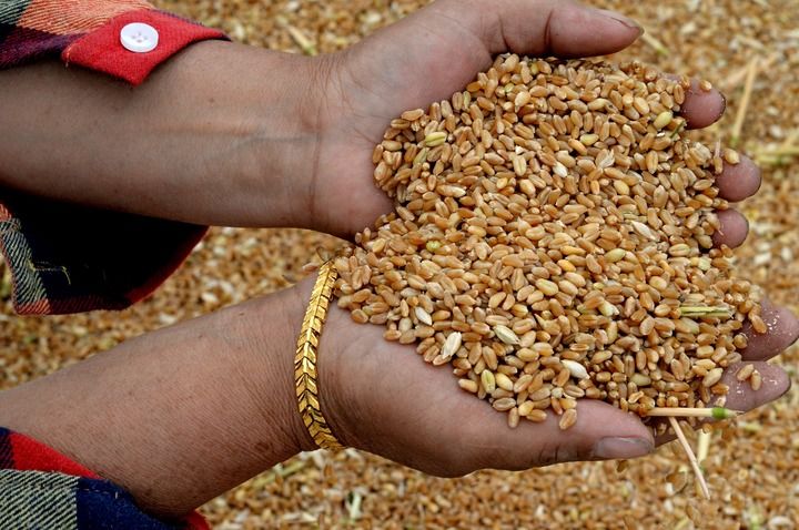 2015年6月4日,山东省滕州市东沙河镇小宫山村村民在展示新收的“济麦22”麦粒。新华社记者冯杰摄
