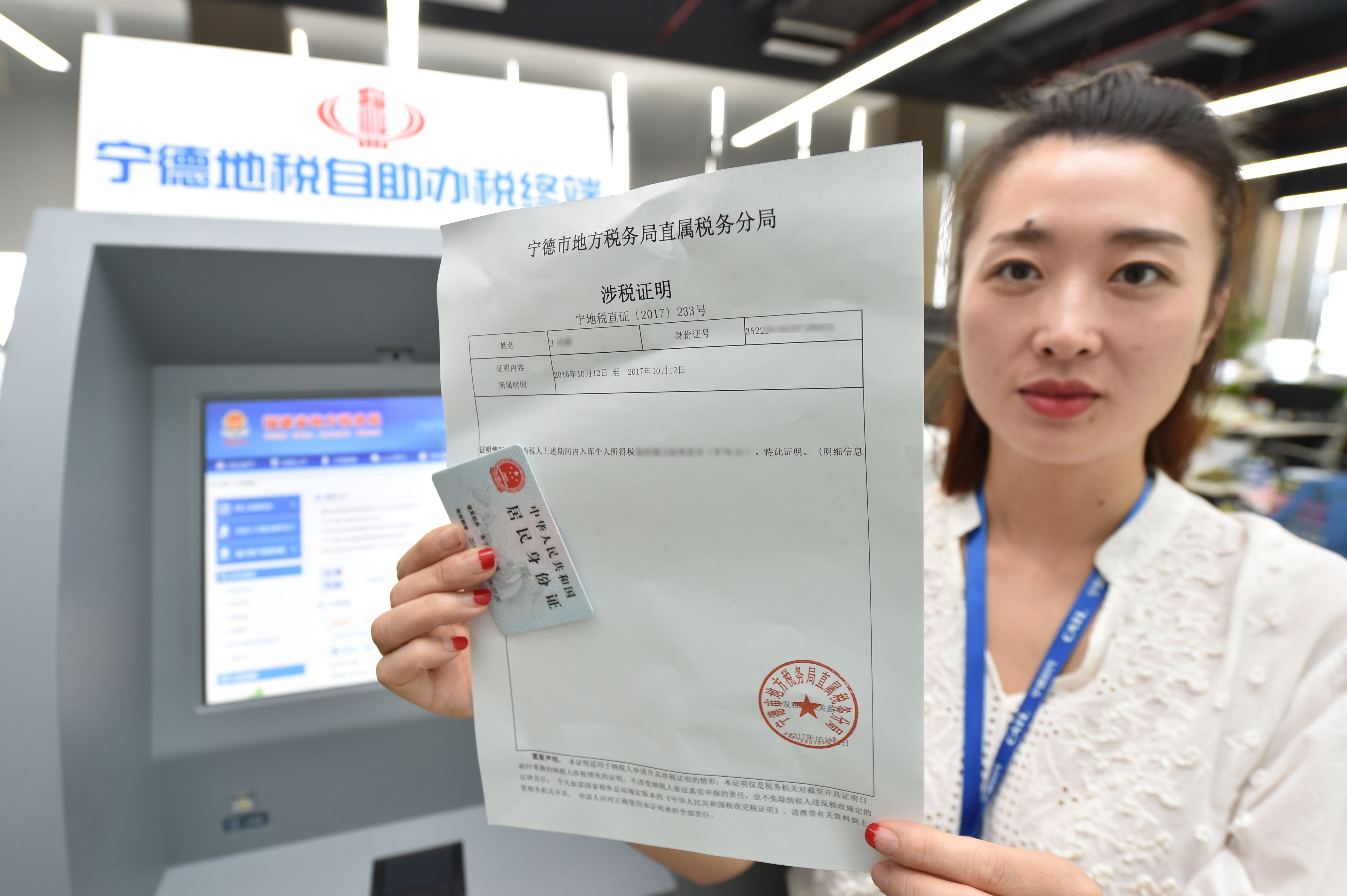 企业员工在展示从自助办税终端打印的涉税证明