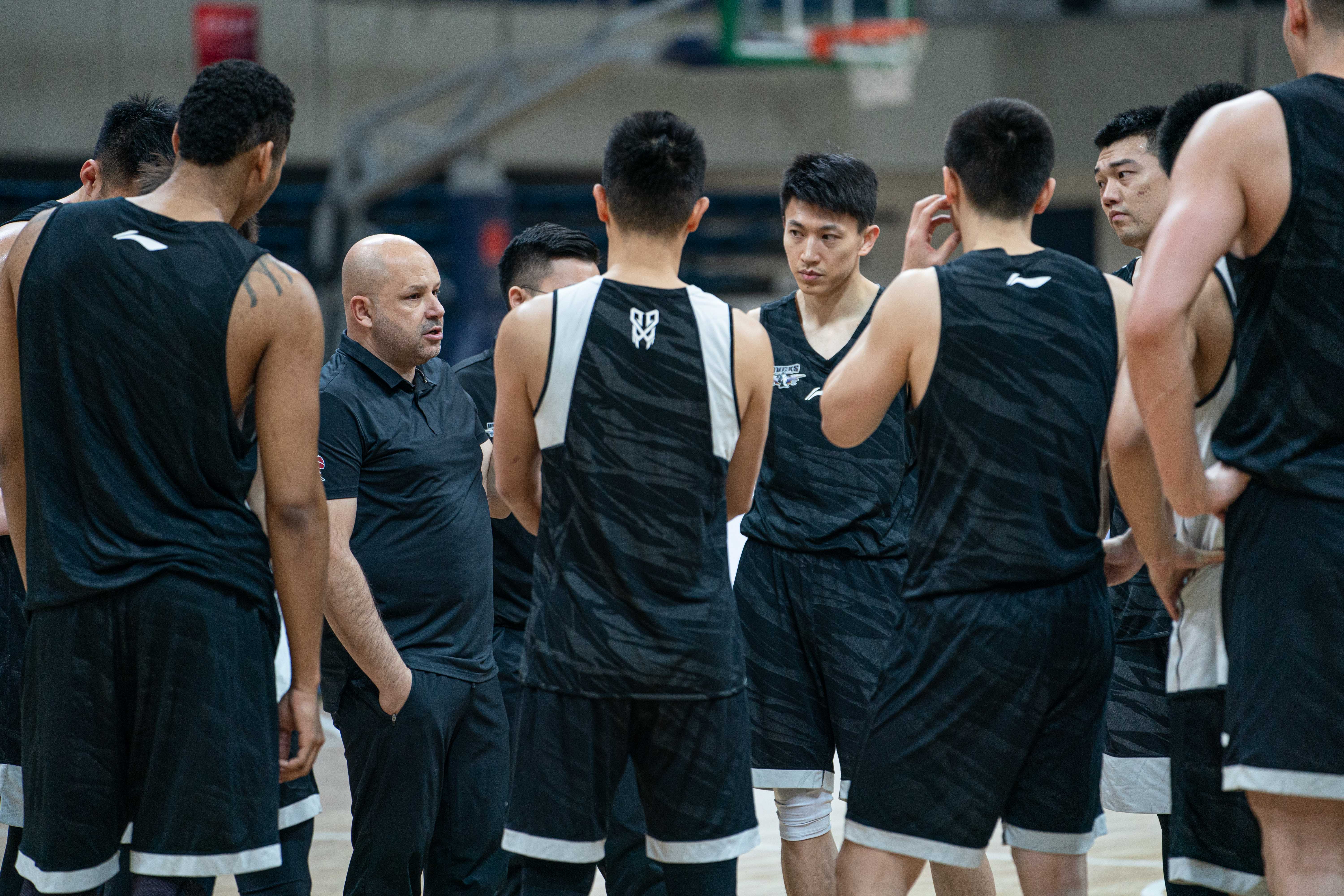 北京首钢队主教练雅尼斯(左三)在训练中与球员交流。新华社记者吴壮摄