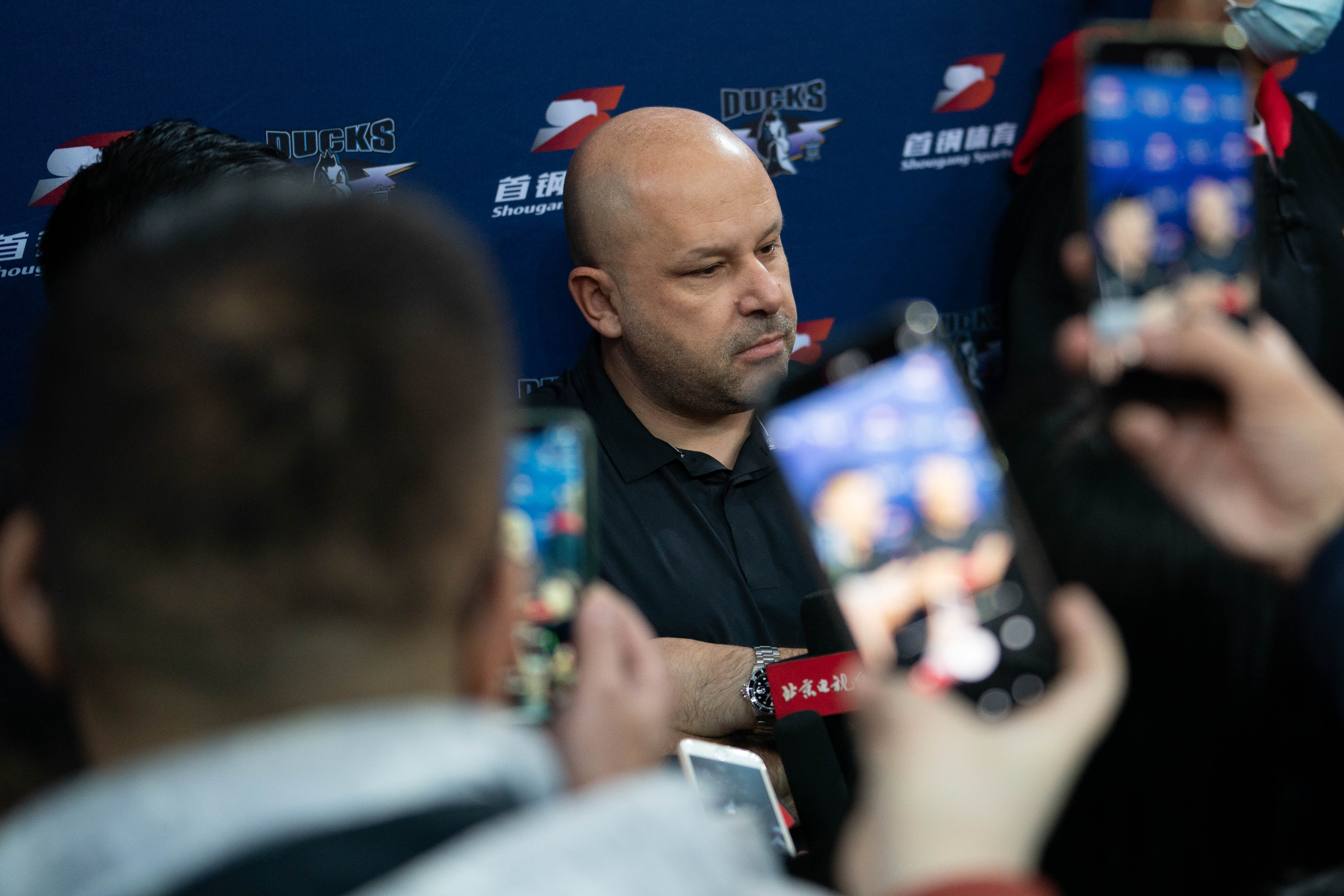 北京首钢队主教练雅尼斯在训练后接受媒体采访。新华社记者吴壮摄