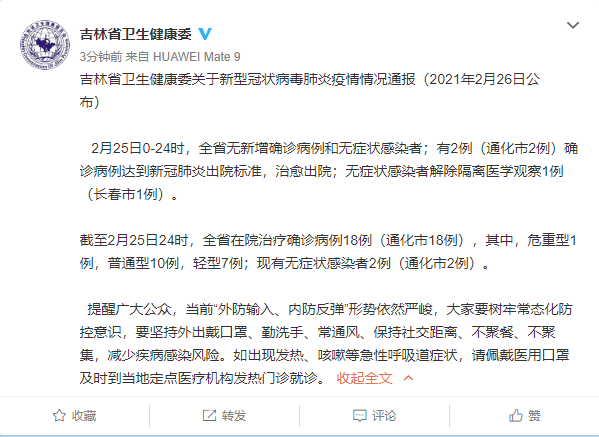 截至2月25日24时,吉林省在院治疗确诊病例18例(通化市18例),其中,危重型1例,普通型10例,轻型7例;现有无症状感染者2例(通化市2例)。