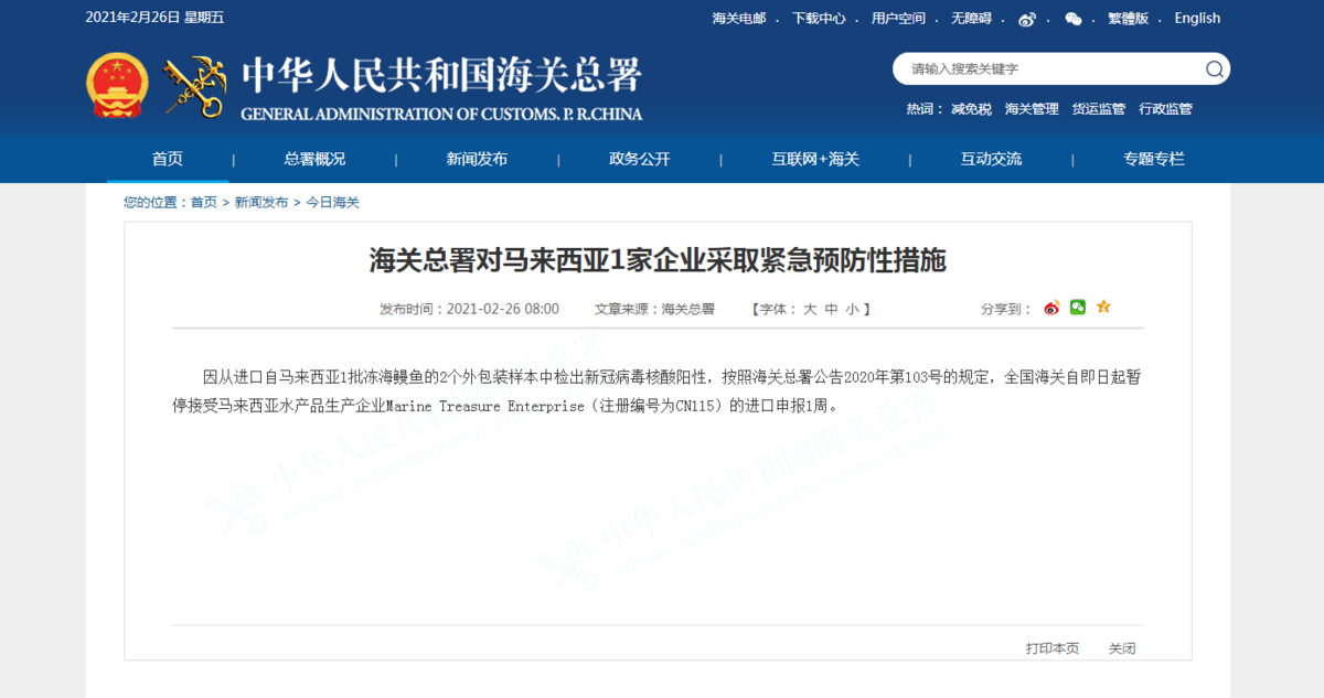 据海关总署网站26日消息,因从进口自马来西亚1批冻海鳗鱼的2个外包装样本中检出新冠病毒核酸阳性,按照海关总署公告2020年第103号的规定,全国海关自即日起暂停接受马来西亚水产品生产企业Marine Treasure Enterprise(注册编号为CN115)的进口申报1周