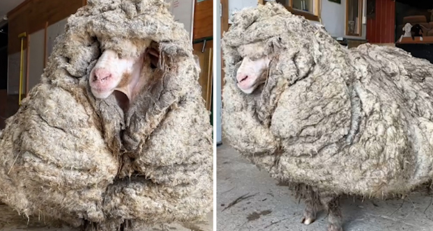 ·澳大利亚一只野外生活的绵羊被剪下70斤羊毛,已有5年没剪。