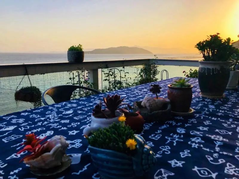 此刻,夕阳以极慢的速度吻向海平线,一艘晚归的渔船独自穿行在玫瑰色的波光里,紫菜养殖田错落的围杆在海面投下线条简洁的倒影。一大群反嘴鸥和遗鸥在退潮的海滩上觅食,一只苍鹭独立在竹篙上,站成一幅遗世独立的剪影。与大海零距离的露台上,我将茶盅落在印着篆文的桌布上,多肉植物养在海螺壳里,小狗九月穿行在花草间,时时趴上我的膝盖,青梅竹马们忙着煮茶、做菜。我拿起悬空鼓槌轻轻敲了敲,空灵悠远的嗡嗡声在沉寂的冬日旷宇中回响。喝着为康朋友自酿的米酒,刚在渔村买的、还带着阳光和海风味道的风潺鱼干独一无二的鲜香还在舌尖流连。我想一直这么待着,什么也不想,从清晨到黄昏;我想一直这么醉着,什么也不想,从黄昏到清晨。“水一方”是一个温暖港湾,拯救生命甚或灵魂的地方。