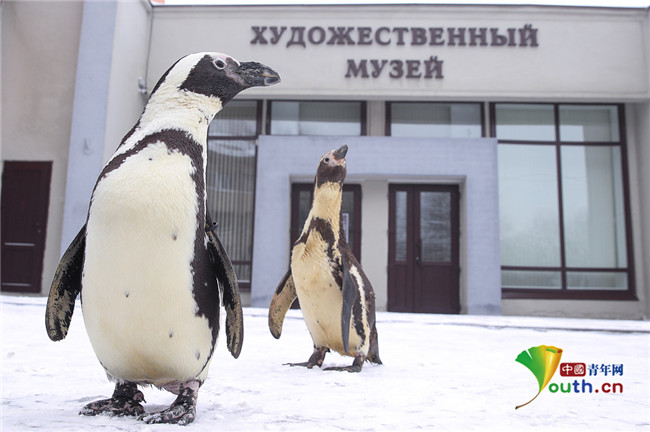 俄罗斯马戏团企鹅“参观”艺术博物馆