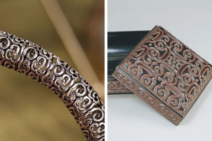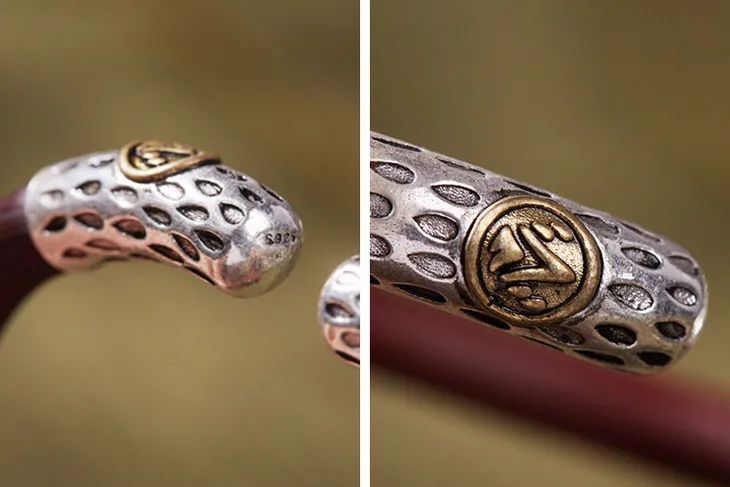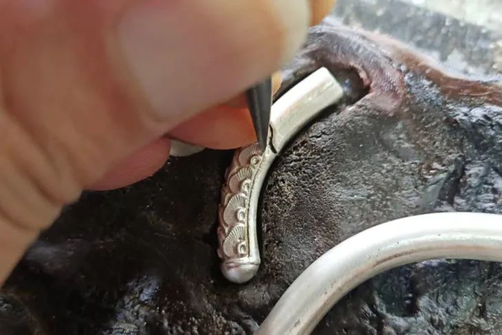 先卷银成筒、焊点花纹,再用矬子细细打磨至光滑。然后银筒封顶,用不同小钢钎在银器上砸出精美图腾,镶嵌到藤条之上。整个过程,全凭匠人一双巧手。