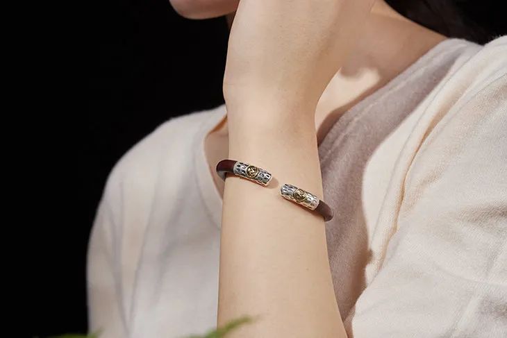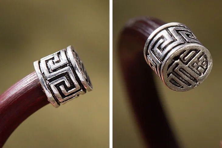 镯子两头,925纯银打制成古铜器上的回纹样,回环反复不绝,寓意富贵不断头。开头处“福”字相对,代表纳福进门,福气满堂。